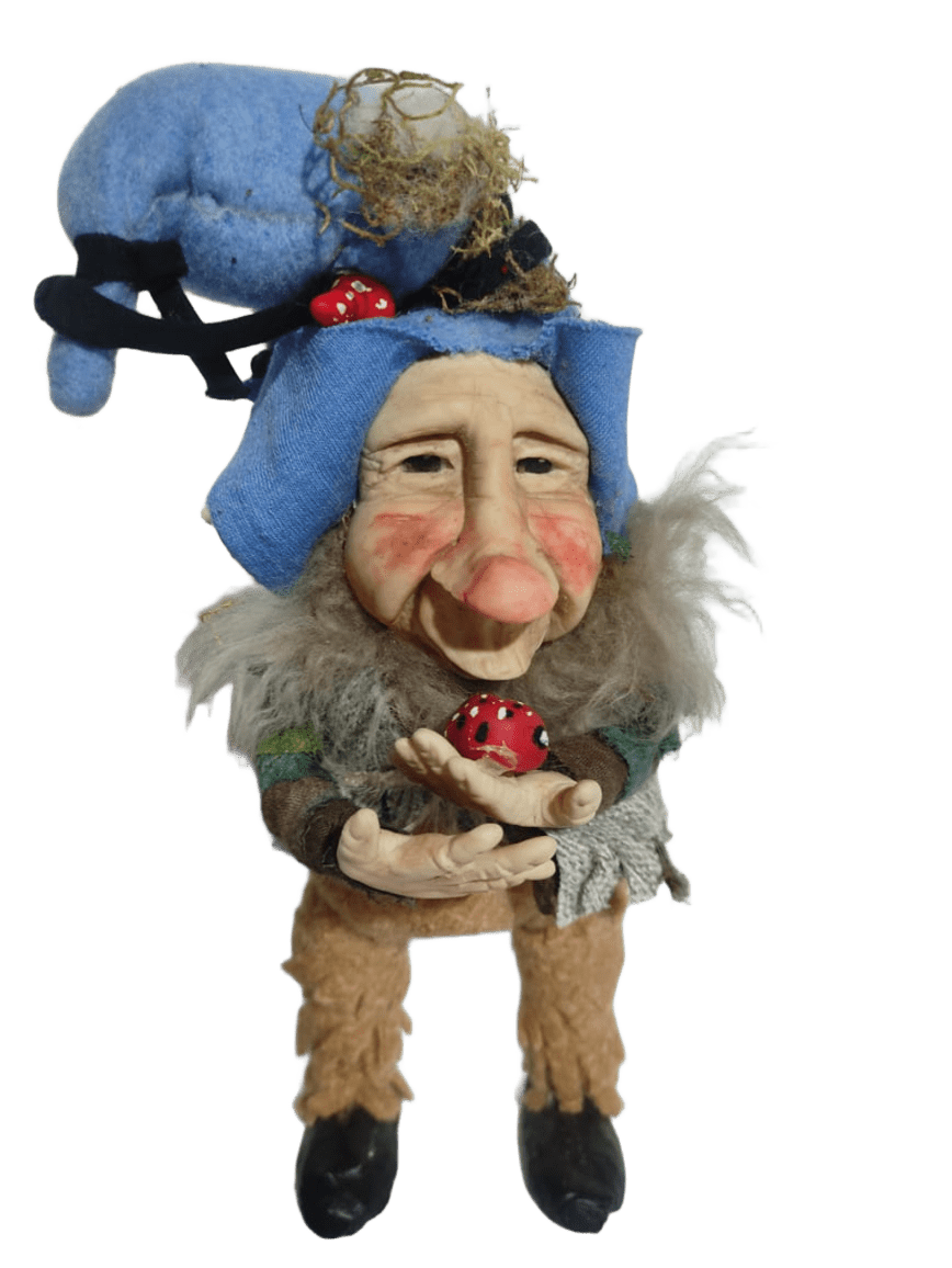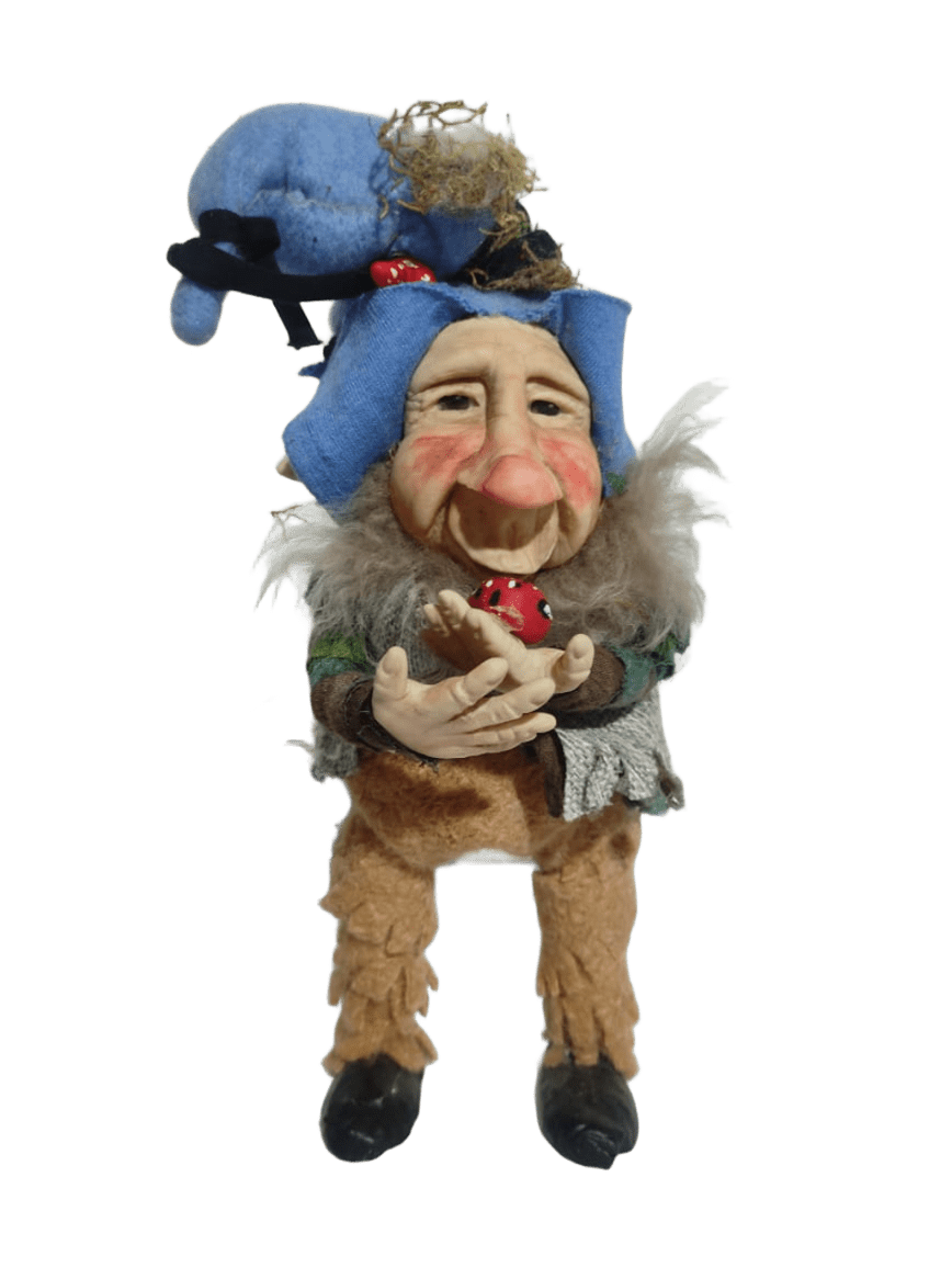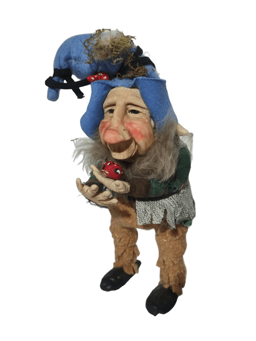 🧢 Gorro azul con detalles naturales: Adornado con musgo y pequeñas figuras, es un reflejo de su conexión con la naturaleza y la magia del bosque.